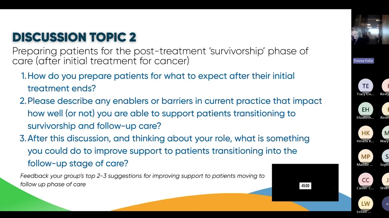 In the afternoon, the Australian Cancer Survivorship Centre led two discussion sessions on preparing cancer patients for the post-treatment ‘survivorship’ phase of care. Summaries of insights from each session are recorded below: